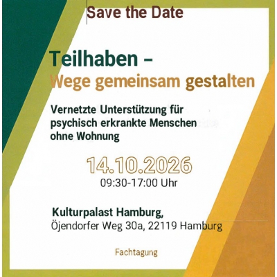 Unbedingt freihalten: Im Oktober findet eine Fachtagung zum Thema "Teilhaben - Wege gemeinsam gestalten" zur Unterstützung von psychisch erkrankten Menschen ohne Wohnung statt. Diese Fachtagung will nicht nur Probleme aufzeigen, sondern Impulse geben, Netzwerke stärken und gemeinsam neue Wege entwickeln. Wir wollen Türen öffnen, die bisher verschlossen waren, und die Praxis verändern: niedrigschwellig, bedarfsorientiert und mit Blick auf die Lebensrealität der Betroffenen. Alle weiteren Infos hier.
